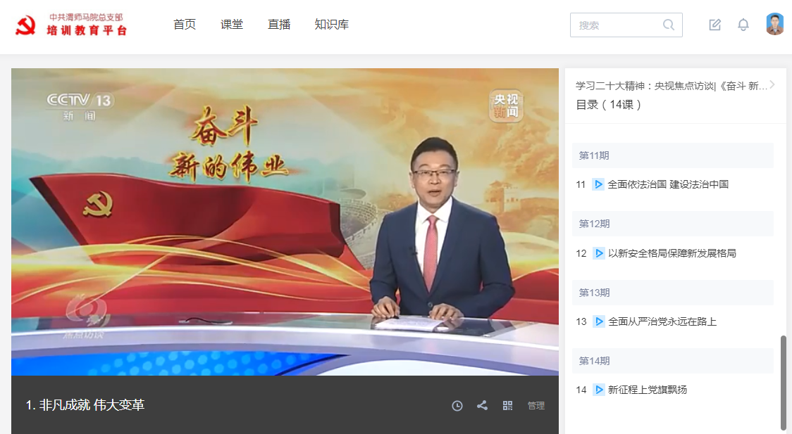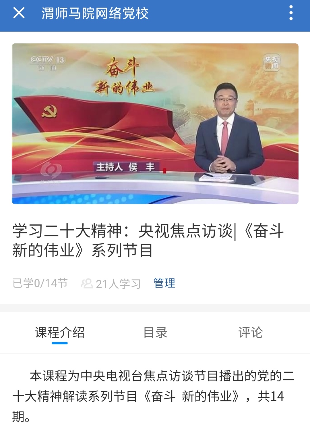 按照我院《关于在2023年春节期间开展“我们的节日•喜迎新春 追梦玉兔”活动的通知》要求,我院在我院网络党校课程学习系统新增了师生学习课程《学习二十大精神:央视焦点访谈|<奋斗 新的伟业>系列节目》,于1月17日起通知师生自主学习。截止目前,有21人学习。