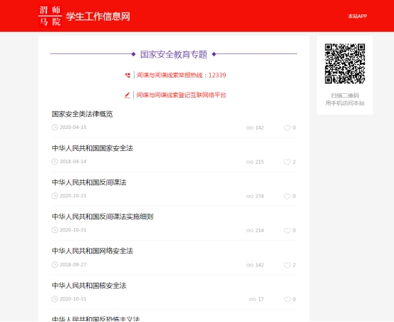 我院高度重视学生的国家安全教育工作。2018年以来,学院学工信息网开设了国家安全教育专栏,持续发布国家安全事件案例、国家安全事件防范方法和大部分国家安全类法律法规,为学生自我教育、教师日常教育、教育日集中教育提供信息支持。