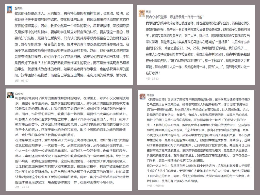 观影后,我院按计划在学院内部网络论坛开设了观影交流专题。截止发稿,已有三十多名以党员、入党积极分子、发展对象为主的师生从不同的角度,结合自己工作或未来职业规划,主动跟帖发表观影心得,就思政课教师、辅导员应有的素质,或自己遇到的好老师,或个人的不足与努力方向,或对思政课教师职业特殊性的认识等畅谈观点,分享收获,我院师生阅读量已达450多人。