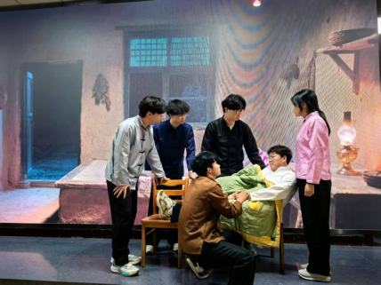 《米家窑之光》以米家窑厚重的革命历史为蓝本,深入挖掘当地军民在革命战争年代的动人故事与牺牲精神。在学院指导教师王岚与肖宝荣的带领下,同学们利用课余时间,查阅史料、打磨剧本、反复排练,最终将那段烽火岁月中普通人的信仰、奋斗与奉献搬上舞台。全剧通过革命战士和群众舍生忘死,一次次穿越敌人的封锁线和碉堡哨卡,多次护送党和军队的领导同志过关中、传送文件情报、运送粮食和弹药的感人故事。生动再现了那段烽火岁月里共产党人坚定的理想信念、无私的奉献精神以及与人民群众的深厚情谊。舞台光影交错间,米家窑不再仅是地理坐标,更化身为信仰的灯塔,照亮了历史,也映照着当下青年的心灵。