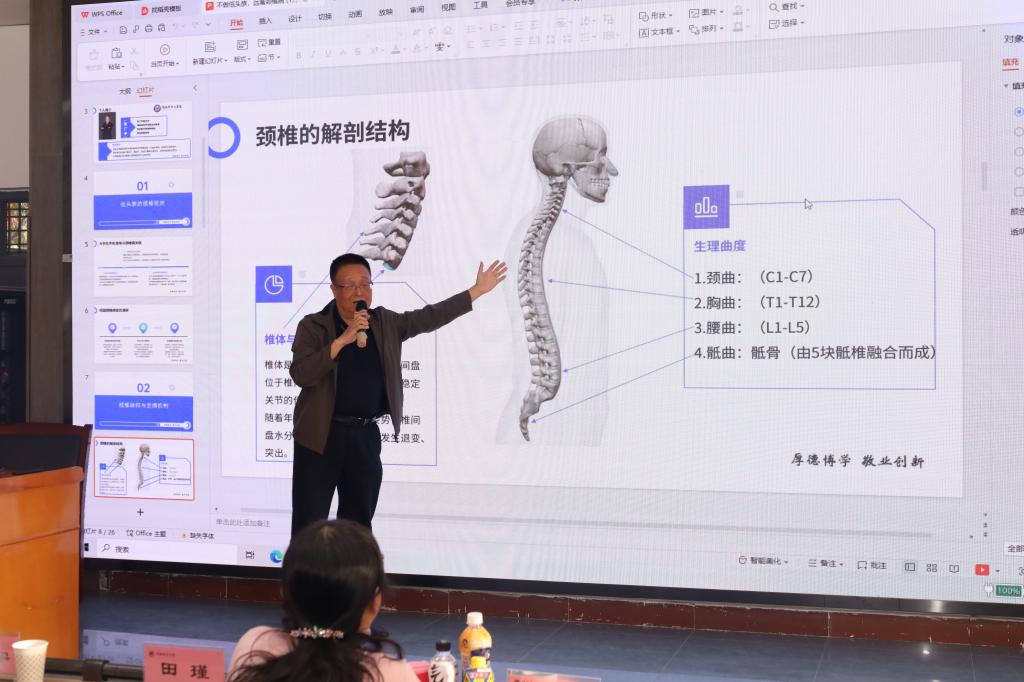 骨科主任医师、科主任雷广宇医生以《不做低头族,远离颈椎病》为题,讲解了人体颈椎结构、脊柱结构、学生常见颈椎病及其发病原因,介绍了颈椎病的日常预防方法、椎间盘病的类型及其治疗不同治疗方式,等等。