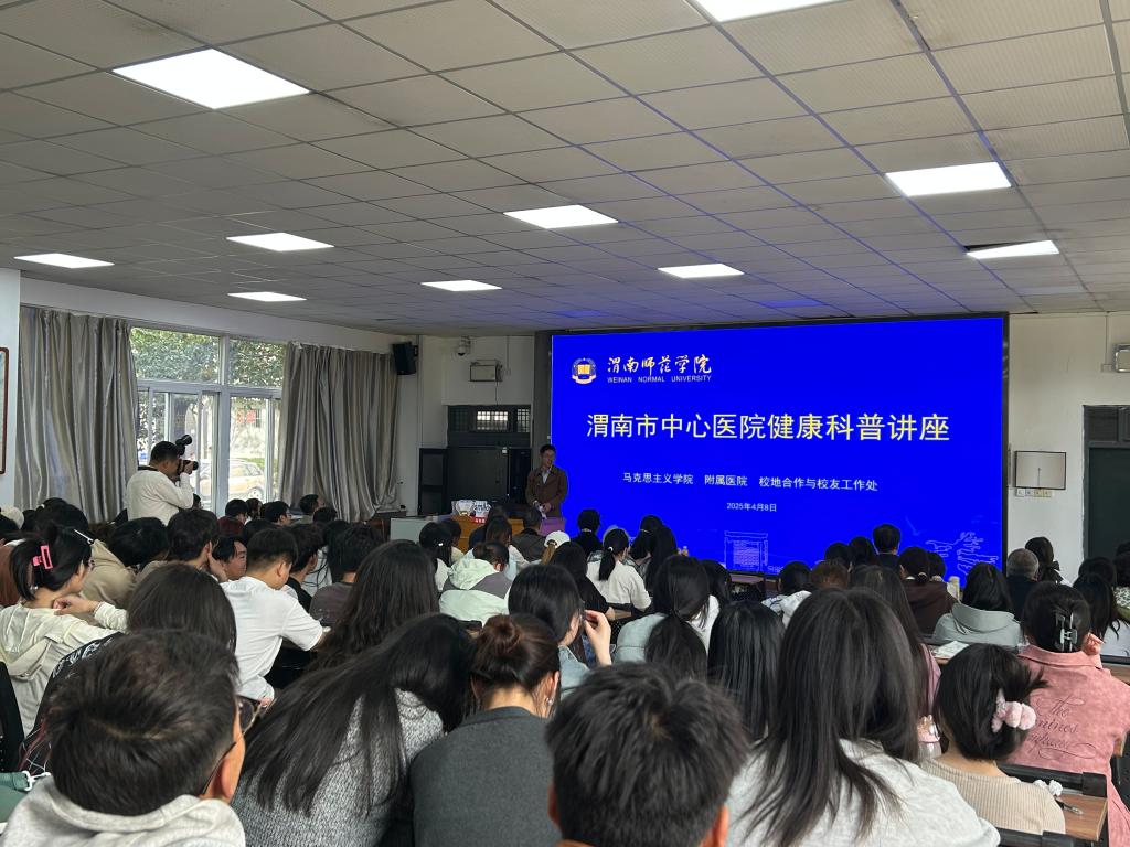 4月8日,由我院主办、校地合作与校友工作处与附属医院联协办的渭南市中心医院公益健康科普知识讲座成功举办。渭南市中心医院内分泌科主任胡田颖、眼科主任田瑾、骨科主任雷广宇、院前急救科主任王海龙等四名医学专家为我校师生送上了难得的、全面的、切合学校师生实际需求的健康自我保护知识。渭南市中心医院外联部负责人,我校校地合作与校友工作处负责人,我校附属医院负责人和医护人员,tyc33455cc太阳成集团部分师生,2号公寓“一站式”学生社区部分宿舍舍长等120多人到场听讲。