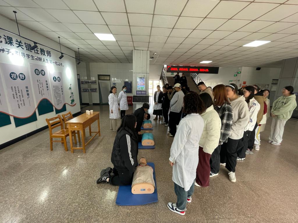 3月17日下午,我院邀请附属校医院,在一号教学楼一层大厅对我院师生作了心肺复苏急救培训。我院部分教师、各班身心健康与体育活动委员、2号公寓学生代表等近100人到场接受培训、模拟练习。附属医院副院长王新英等附属医院领导、医护人员到场培训。