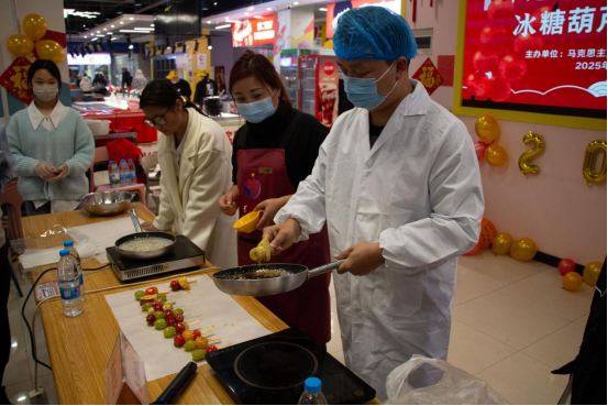 随后,活动现场被划分成了多个小组,在专业老师的指导下,师生们纷纷化身“糖艺大师”,小心翼翼地将它们串在竹签上,再蘸入熬得金黄透亮的糖浆中,旋转、翻滚,直至每一颗果实都被均匀地包裹上了一层晶莹剔透的糖衣。