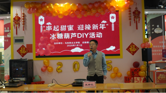 活动开始前,党总支书记赵国峰发表了热情洋溢的致辞,对学校后勤、二餐工作人员对学院工作的支持和2024年的辛勤劳动表达了谢意。他表示,劳动教育是我校人才培养的光荣传统,此次活动是对劳动教育形式的又一次创新,更有意义、更受师生欢迎,也是一次对中国传统美食文化的传承教育。希望这次活动能让学院对师生的新年祝福随着一串串晶莹剔透的冰糖葫芦,传递到每一位师生的心中。