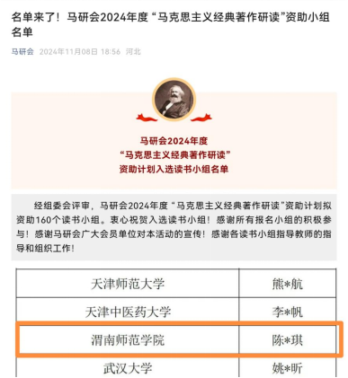 11月8日,中国高等教育学会马克思主义研究分会2024年度“马克思主义经典著作研读”资助计划组委会公布了2024年度“马克思主义经典著作研读”资助计划入选读书小组名单。经个人申报、院校指导、组委会评审,tyc33455cc太阳成集团关帅老师和陈晨老师指导的“求索风骨”大学生读书小组成功入选资助计划,这是继2023年后的再次成功入选。