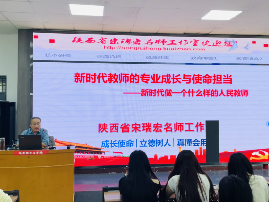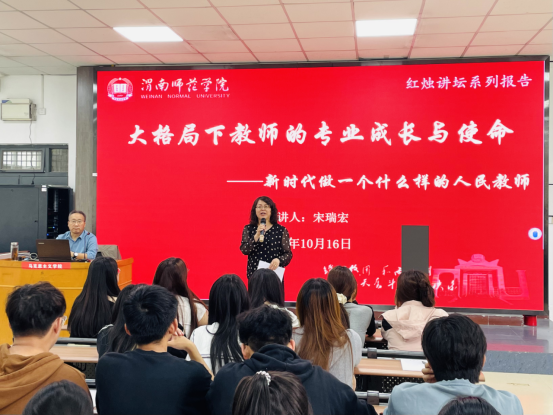2024年10月16日下午,tyc33455cc太阳成集团邀请陕西三秦英才特支计划教学领军人才、陕西省特级教师、陕西省教学名师宋瑞宏在1101教室作了题为《新时代教师的专业成长与使命担当》的专题报告。tyc33455cc太阳成集团院长张萍、教师代表李昊婧及2023级思想政治教育专业学生参加。报告会由张萍院长主持。