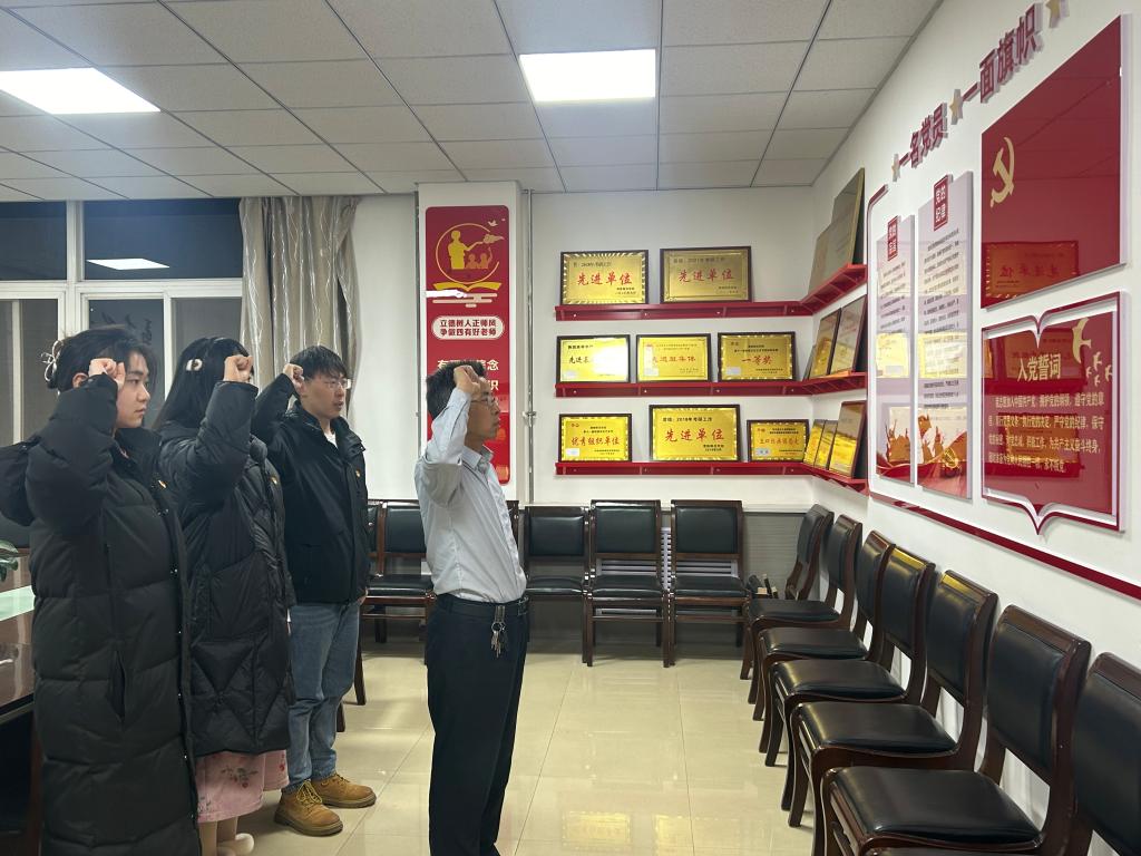 12月14日,党支部在学院党员活动室举行了该三名同志入党宣誓仪式。仪式上,党支部书记赵国峰为三名同志发放、佩戴了党员胸章,带领三人面向党旗诵读了入党誓词,并讲话。