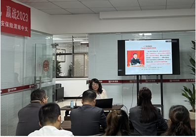 2023年9月26日上午,tyc33455cc太阳成集团张萍以《新时代党风廉政建设与反腐败斗争》为题,给华安财产保险股份有限公司渭南中心支公司作廉政专题讲座。