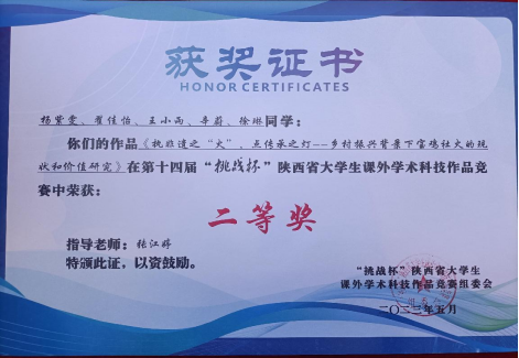 5月20日,由团省委、省委教育工委、省科技厅、省科协、省社会科学院、省学联、西咸新区管委会共同主办,长安大学承办的第十四届“挑战杯”陕汽集团陕西省大学生课外学术科技作品竞赛闭幕式暨颁奖仪式在长安大学圆满落幕。我院思想政治教育专业2021级杨紫雯、翟佳怡、王小雨、辛蔚、徐琳5名同学的作品《执非遗之“火”,点传承之灯---乡村振兴背景下宝鸡社火的现状和价值研究》获省级二等奖。