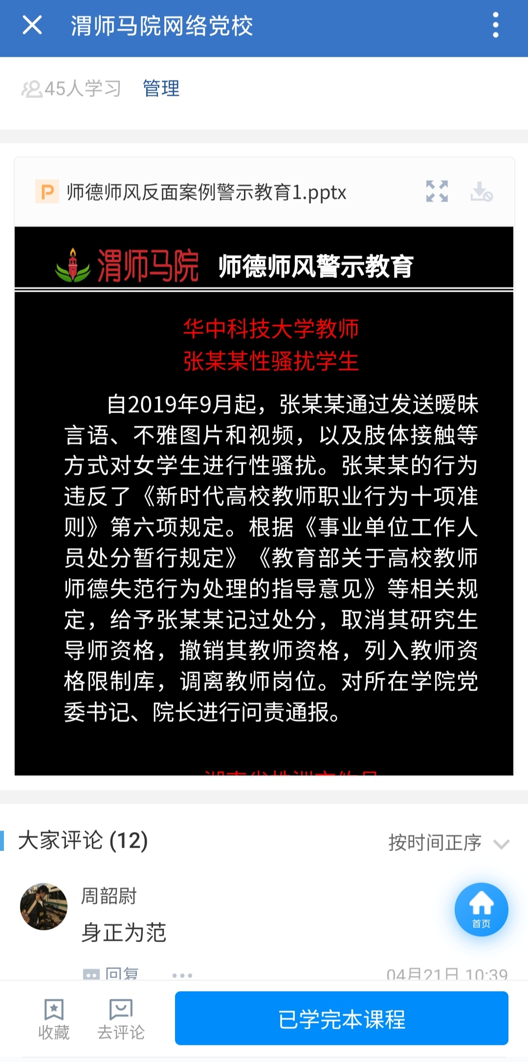 4月21日起,我院按照学校党委安排,通过内部网上办公系统、网络党校两个互联网平台,以推送警示教育图文、开设反面案例课程两种相互结合的形式,面向全体教师再次开展了师德师风警示教育。
