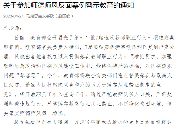 在推送的警示教育图文中,学院强调,党的二十大报告明确指出,要加强师德师风建设,培养高素质教师队伍,弘扬尊师重教社会风尚。教育部、我校对对师德违规问题始终持“零容忍”态度,对一切师德违规行为都要严肃处理。希望学院教师明确师德师风第一标准,认真自查自纠,从反面案例中吸取教训,自觉自律。