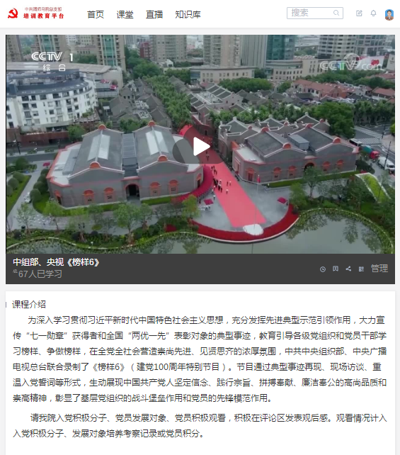 结合校党委关于各二级单位党组织组织师生党员学习收看中央组织部、中央广播电视总台联合录制播出的《榜样6》(建党100周年特别节目)的要求,我院于昨天晚上以该期节目为内容,制作并在我院网络党校发布了同名网络课程,供师生学习。