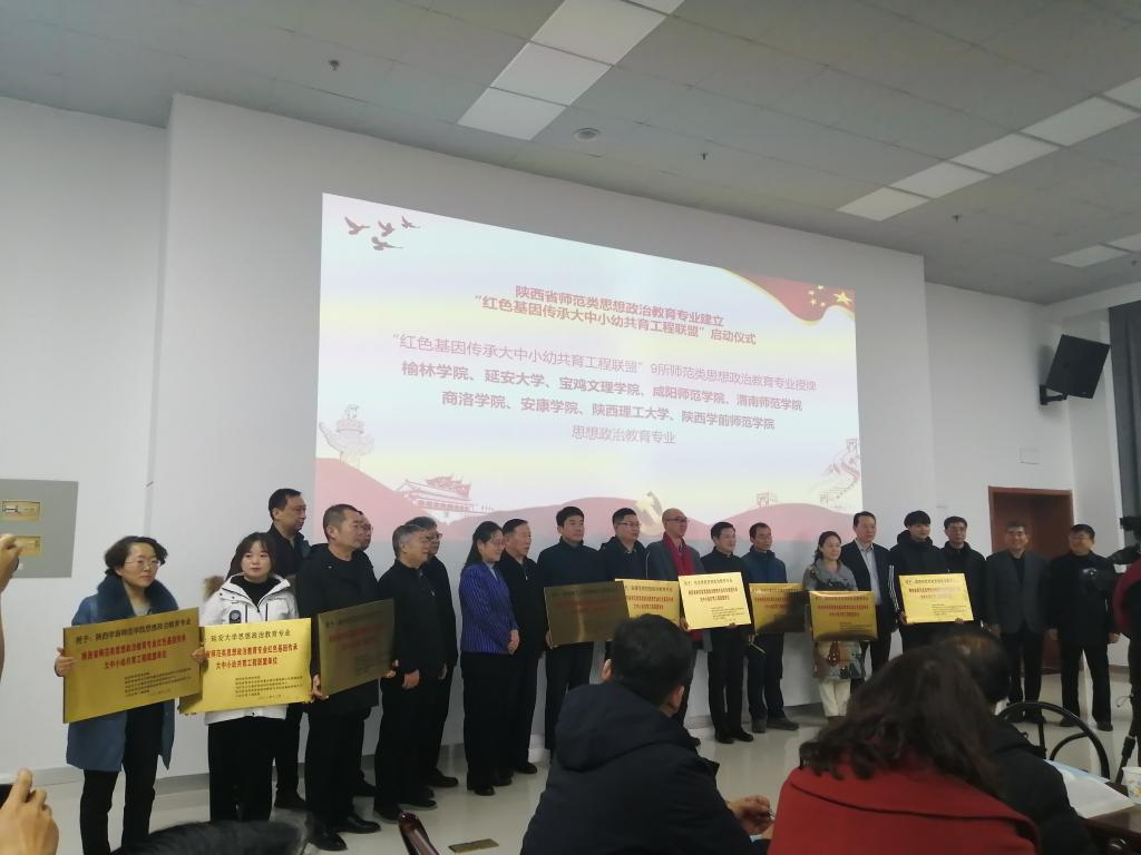 为协同进行红色基因传承教育,会议主办单位陕西学前师范学院省哲学社会科学重点研究基地核心价值观培育与红色文化基因传承协同创新研究中心,联合榆林学院、延安大学、宝鸡文理学院、咸阳师范学院、太阳成集团tyc33455cc、商洛学院、安康学院、陕西理工大学、陕西学前师范学院等高校的师范类思想政治教育专业,建立“红色基因传承大中小幼共育工程联盟”,发扬师资培养培训优势,同全省中小学和幼儿园一起,建设“陕西红色基因传承大中小幼共育工程”。陕西省政协副主席王二虎等领导为共育工程单位授牌。