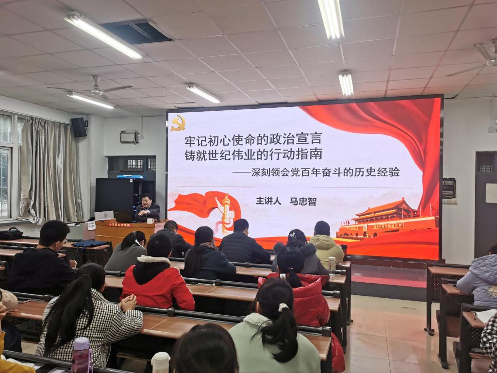 12月7日下午,应我院邀请,学校十九届六中全会精神理论宣讲团在我院作了宣讲报告。报告会由我院党总支临时负责人主持,由宣讲团负责在我院宣讲的马忠智教授作了题为《牢记初心使命的政治宣言,铸就世纪伟业的行动指南——深刻领会党百年奋斗的历史经验》的报告。学院无课教师、团总支全体成员、非毕业班团支部书记、明理坊成员、学生党员、党员发展对象、学生思想政治宣讲队成员到场听讲。