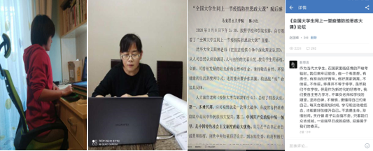 大家认真听课,获益匪浅。课后,师生在线进行了热烈的讨论和交流,一致认为,今天的思政大课直播非常精彩,艾四林、秦宣、王炳林、冯秀军四位专家教授理论联系实际,用马克思主义基本原理分析这场新冠肺炎疫情大考,引导大学生在抗击疫情斗争中深化理论认识、社会主义制度和党的领导的优越性、构建历史的经验与反思、青春爱国责任与担当等问题,条理清楚,逻辑严密,以理服人,以情动人,效果良好。
