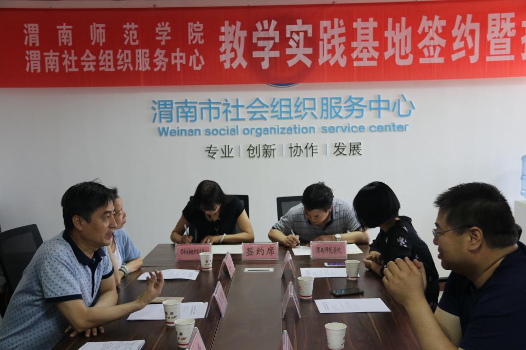 为进一步强化我院社会工作专业实践教学环节,提高学生社会工作实务能力与水平,加强学校与企事业单位和社会各界的广泛合作,2018年5月29日下午,我院与渭南市社会组织服务中心合作共建的社会工作专业教学实践基地在市社会组织孵化基地举行签约暨挂牌仪式。会议由渭南市社会组织服务中心执行主任杨梅主持。