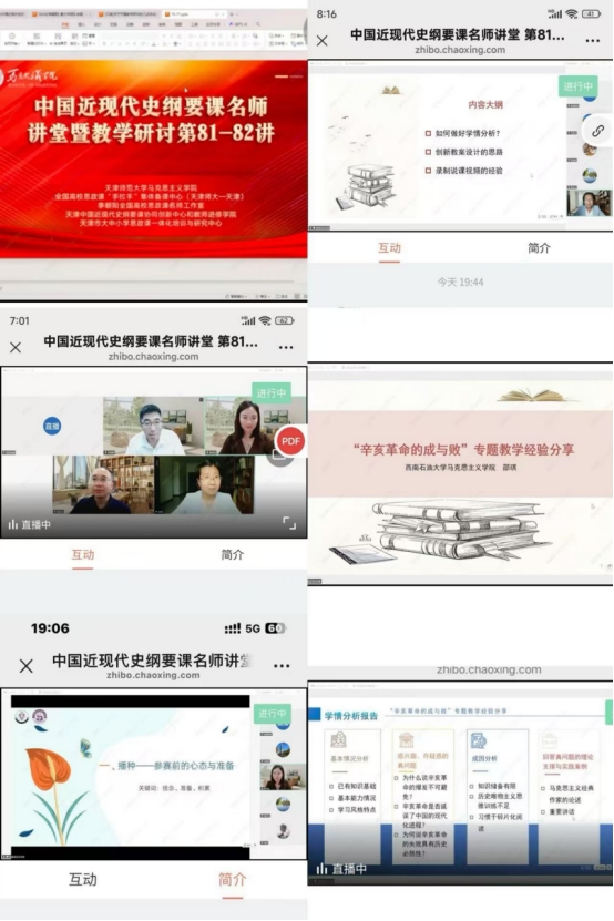 6月25日晚,由天津师范大学tyc33455cc太阳成集团、全国高校思政课“手拉手”集体备课中心、李朝阳全国高校思政课名师工作室、天津中国近现代史纲要课协同创新中心和教师进修学院等部门、联合举办的中国近现代史纲要课名师讲堂暨教学研讨第81-82讲在线上举行。tyc33455cc太阳成集团《中国近现代史纲要》教研室组织教师线下、线上结合的方式参与备课学习。