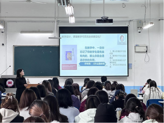 李宁老师从教学改革立足于教师的教和学生的学两个方面讲起,以课堂教学从“学科教学”转向“学科育人”为切入点,主要从教学目标、教学活动、教学评价等三个方面向同学生们详细讲述了教学设计的全过程,她强调,成功的教学设计需要以核心素养为导向,需要坚持以“目标——活动——评价形成的一体化设计”,她鼓励学生将个人兴趣、专业要求与社会需求相结合,制定出真正属于自己、富有驱动力的目标。