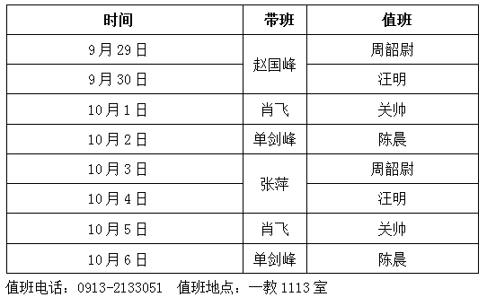 按照学校安排,2023年9月29日至10月6日为中秋节、国庆节放假。假期,tyc33455cc太阳成集团值班安排如下,校内师生、单位办事,校外群众、单位办事,请联系值班人员或到值班处。